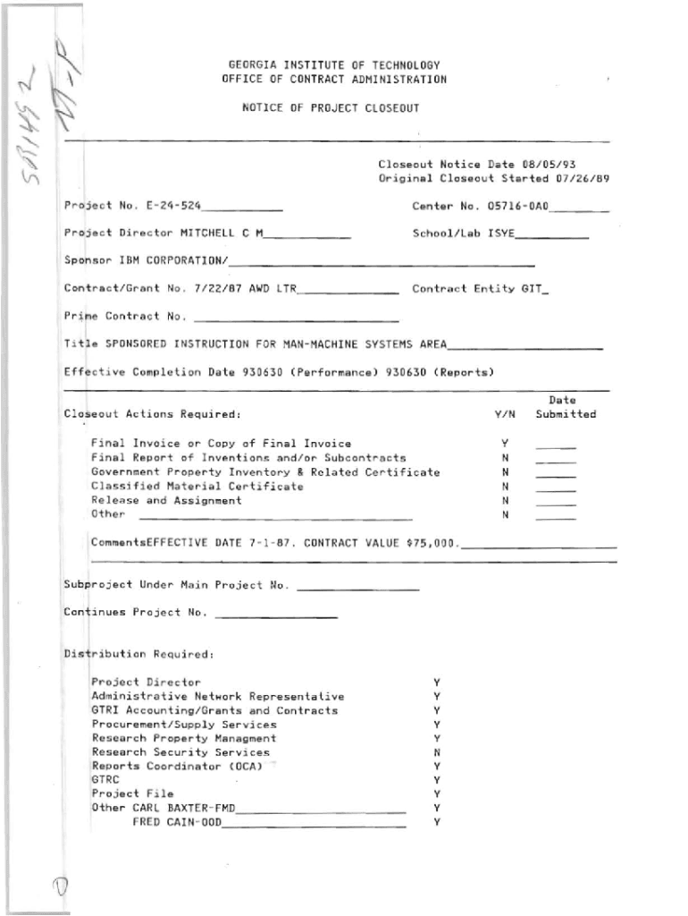 GEORGIA INST IT UTE OF TECHNO LOGY OFFICE OF CONTRACT ADMINISTRATION NOT I CE OF PROJECT CLOSEOUTCloseout Not ice Date 08 /05/93 Original Closeout Started 07/26/89 Prove c t No. E 24524___Center No.