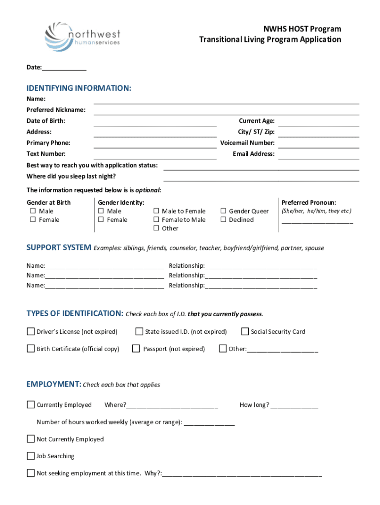 NHS HOST Program Transitional Living Program Application Date:___IDENTIFYING INFORMATION: Name: Preferred Nickname: Date of Birth:Current Age:Address:City/ ST/ Zip:Primary Phone:Voicemail Number:Text