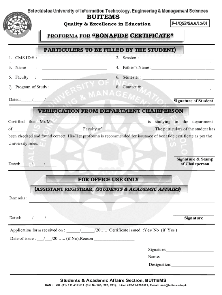 Balochistan University of Information Technology, Engineering & Management SciencesBUITEMS Quality & Excellence in EducationF1/DSP/SAA/15/01PROFORMA FOR BONA FIDE CERTIFICATE PARTICULARS TO BE FILLED