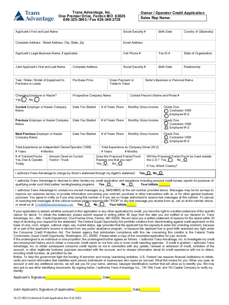 8003253863 / Fax 6363492728Owner / Operator Credit Application