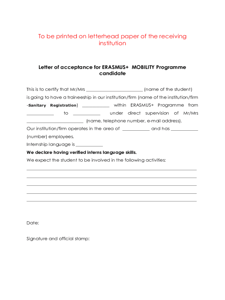 To be printed on letterhead paper of the receiving institutionLetter of acceptance for ERASMUS+ MOBILITY Program candidate This is to certify that Mr/Mrs ___ (name of the student) is going to have