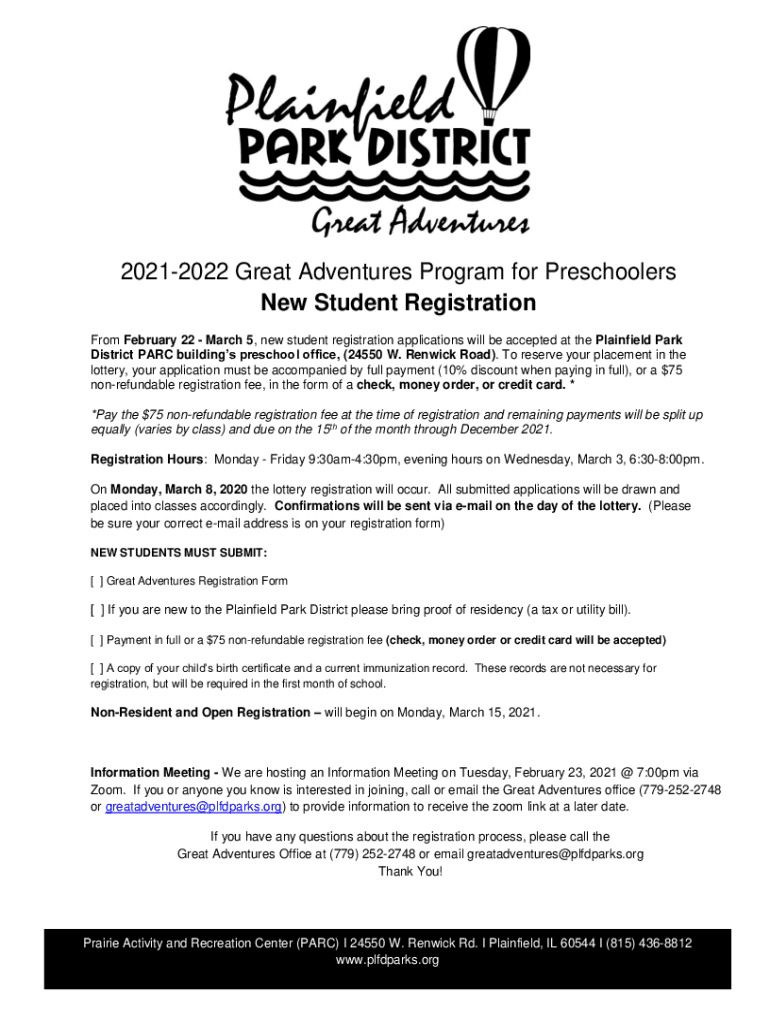 20212022 Great Adventures Program for Preschoolers New Student Registration From February 22 March 5, new student registration applications will be accepted at the Plainfield Park District PARC buildings