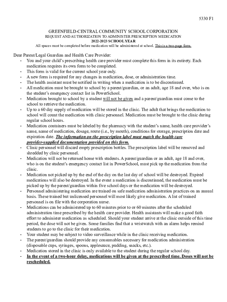 5330 F1 GREENFIELDCENTRAL COMMUNITY SCHOOL CORPORATION REQUEST AND AUTHORIZATION TO ADMINISTER PRESCRIPTION MEDICATION 20222023 SCHOOL YEAR All spaces must be completed before medication will be administered