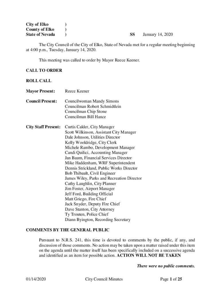 State of Nevada)))SS January 14, 2020The City Council of the City of Elk, State of Nevada met for a regular meeting beginning