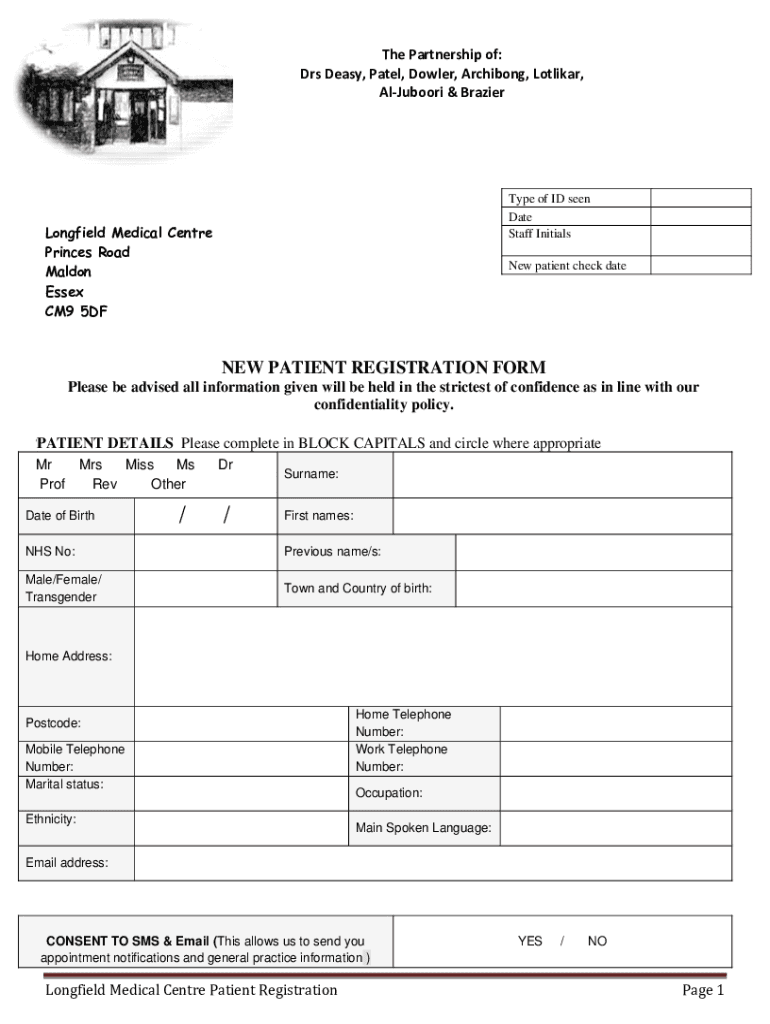 The Partnership of: DRS Easy, Patel, Bowler, Archiving, Bolivar, AlJuboori & BrazierType of ID seen Date Staff InitialsLongfield Medical Center Princes Road Malden Essex CM9 5DFNew patient check dateset