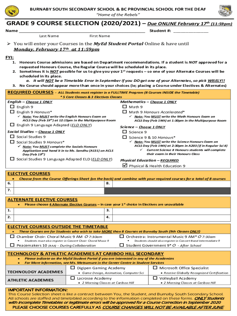 BURNABY SOUTH SECONDARY SCHOOL & BC PROVINCIAL SCHOOL FOR THE DEAF Home of the Belgrade 9 COURSE SELECTION (2020/2021) Due ONLINE February 17th (11:59pm) Name__ ___ Student #: ___ Last NameFirst Name