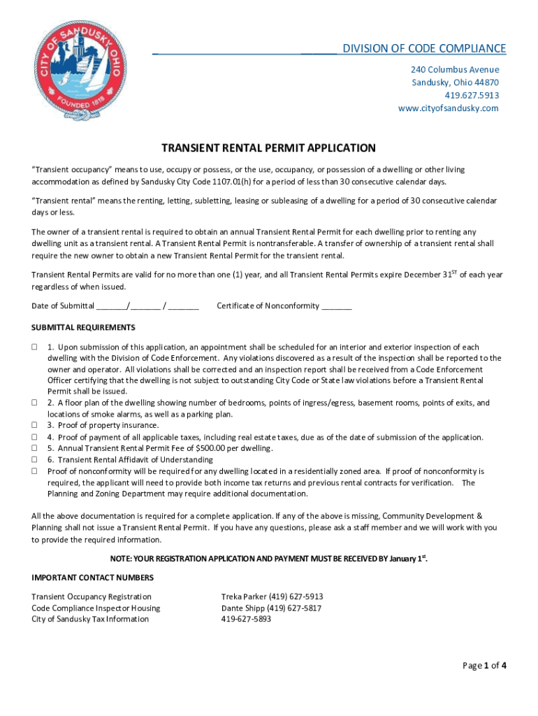____ DIVISION OF CODE COMPLIANCE 240 Columbus Avenue Sandusky, Ohio 44870 419.627.5913 www.cityofsandusky.comTRANSIENT RENTAL PERMIT APPLICATION Transient occupancy means to use, occupy or possess,