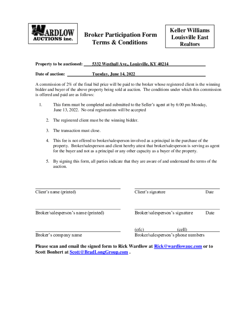 Broker Participation Form Terms & ConditionsProperty to be auctioned:5332 West hall Ave., Louisville, KY 40214Date of auction:Tuesday, June 14, 2022Keller Williams Louisville East Realtors commission