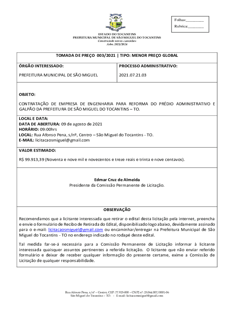 PREFECTURE MUNICIPAL DE SO MIGUEL DO TOCANTINS