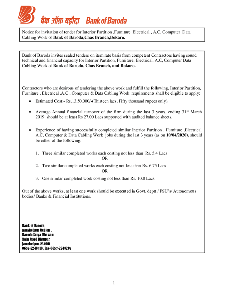 Notice for invitation of tender for Interior Partition, Furniture, Electrical, A. C, Computer Data Cabling Work of Bank of Baroda, Has Branch, Board. Bank of Baroda invites sealed tenders on item