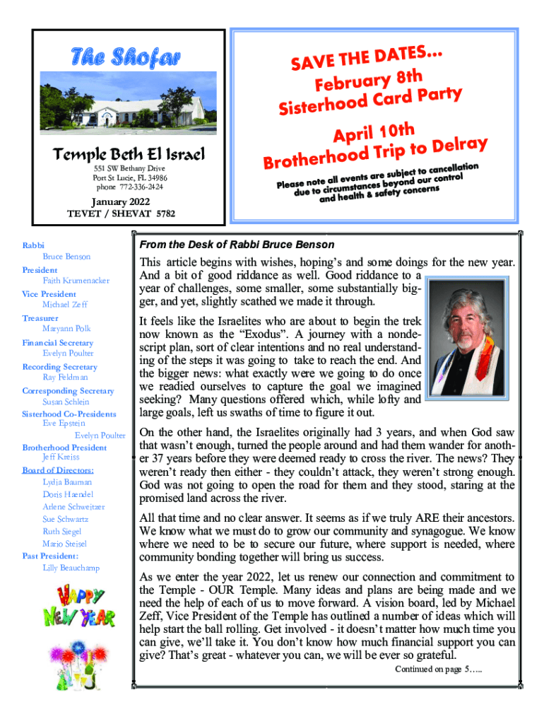 The ShofarTemple Beth El Israel 551 SW Bethany Drive Port St Lucie, FL 34986 phone 7723362424January 2022TEVET / SHEVAT 5782 Rabbi Bruce Benson President Faith Krumenacker Vice President Michael Jeff