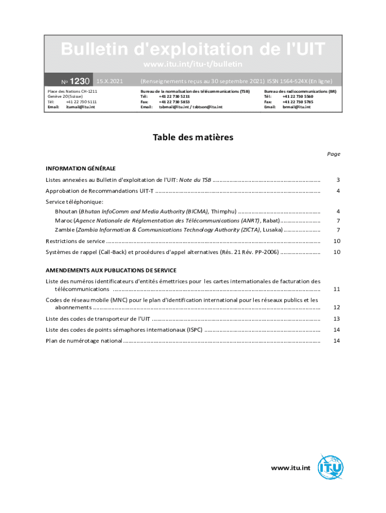 Bulletin d\'exploitation de l\'UIT www.itu.int/itut/bulletin No 123015. X.2021Place DES Nations CH1211 Genre 20 (Swiss) Tl: +41 22 730 5111 Email: itumail@itu.int(Restatements Zeus AU 30 September