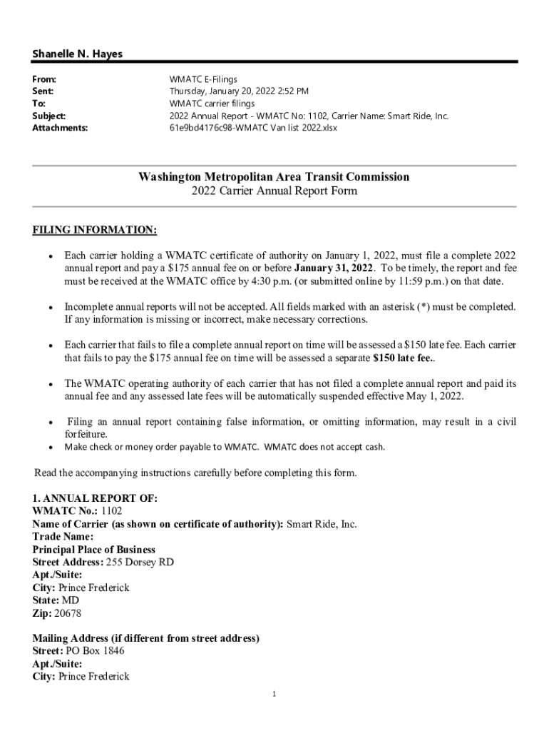 Janelle N. Hayes From: Sent: To: Subject: Attachments:WHAT Filings Thursday, January 20, 2022 2:52 PM WHAT carrier filings 2022 Annual Report WHAT No: 1102, Carrier Name: Smart Ride, Inc. 61e9bd4176c98WMATC