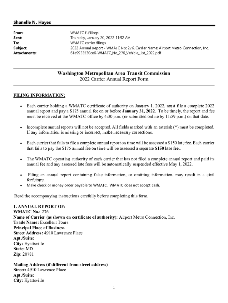 Janelle N. Hayes From: Sent: To: Subject: Attachments:WHAT Filings Thursday, January 20, 2023 11:52 AM WHAT carrier filings 2022 Annual Report WHAT No: 276, Carrier Name: Airport Metro Connection,