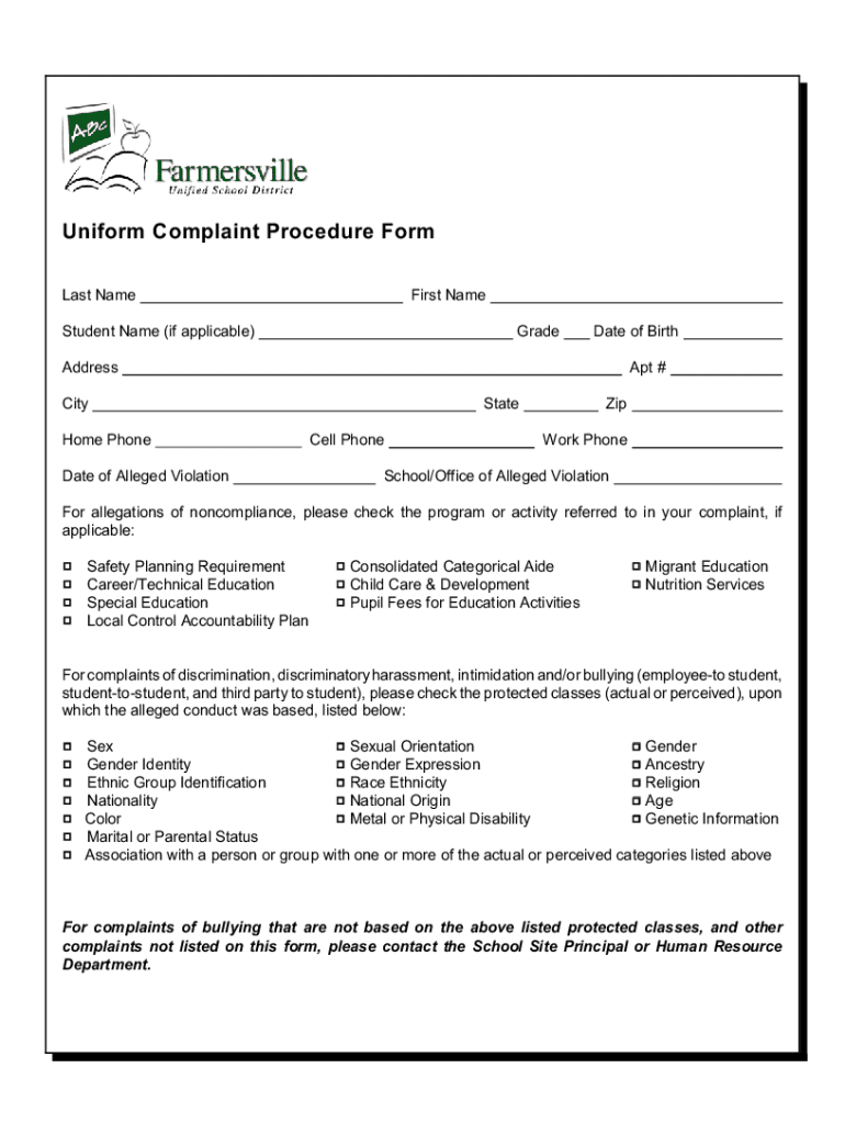 Uniform Complaint Procedure Form Last NameFirst NameStudent Name (if applicable)Grade Date of BirthAddressApt #City Home Phone Date of Alleged ViolationState Cell Phonetic Work Homeschool/Office of