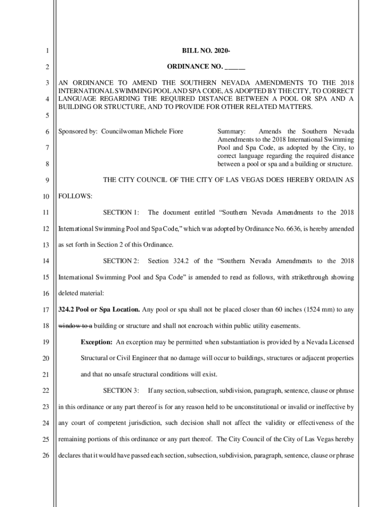 1BILL NO. 20202ORDINANCE NO. ___3AN ORDINANCE TO AMEND THE SOUTHERN NEVADA AMENDMENTS TO THE 2018 INTERNATIONAL SWIMMING POOL AND SPA CODE, AS ADOPTED BY THE CITY, TO CORRECT LANGUAGE REGARDING THE