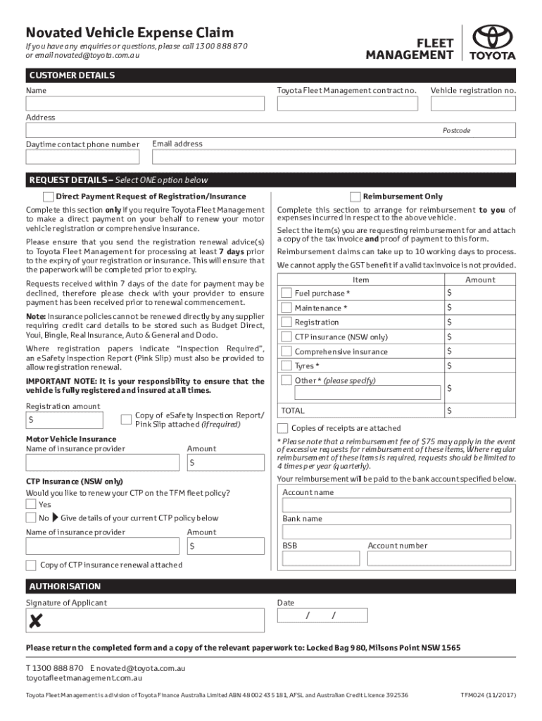 InstructionsPrintClearNovated Vehicle Expense Claimed you have any inquiries or questions, please call 1300 888 870 or email novated@toyota.com.auCUSTOMER DETAILS Name Toyota Fleet Management contract