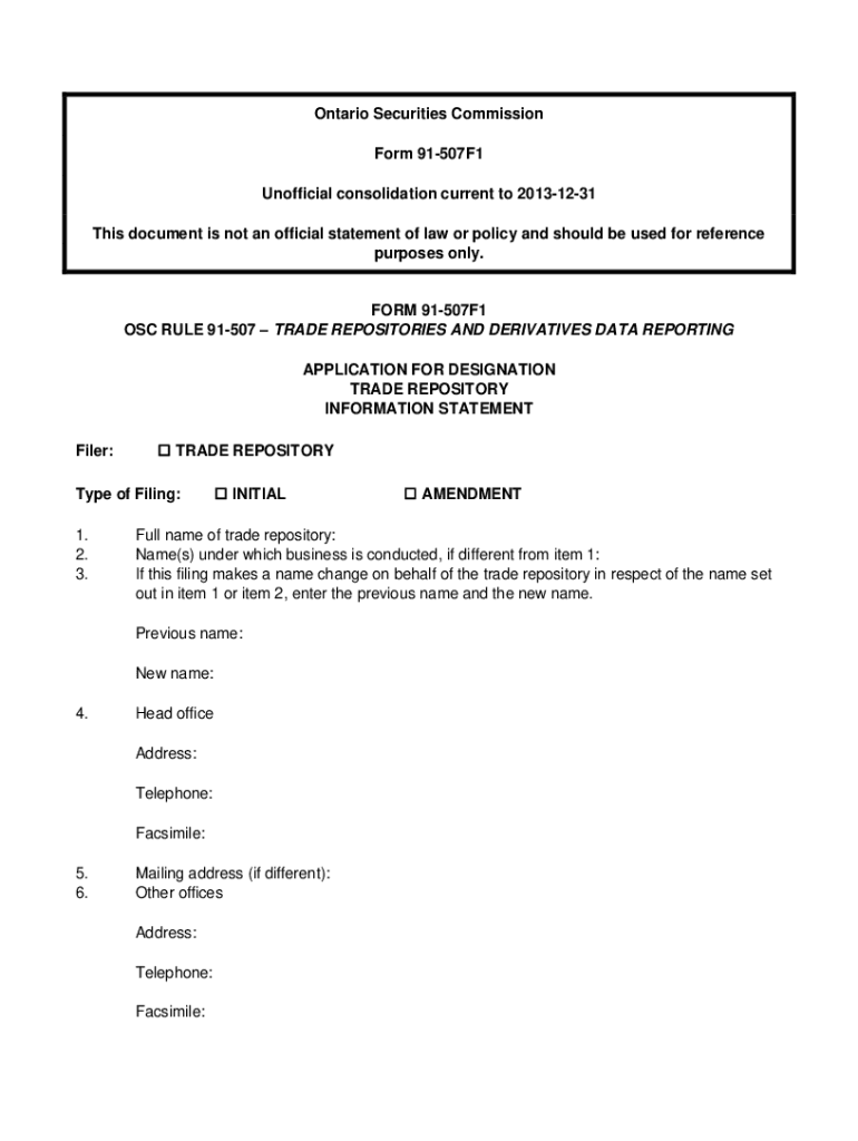 Ontario Securities Commission Form 91507F1 Unofficial consolidation current to 20131231 This document is not an official statement of law or policy and should be used for reference purposes only.