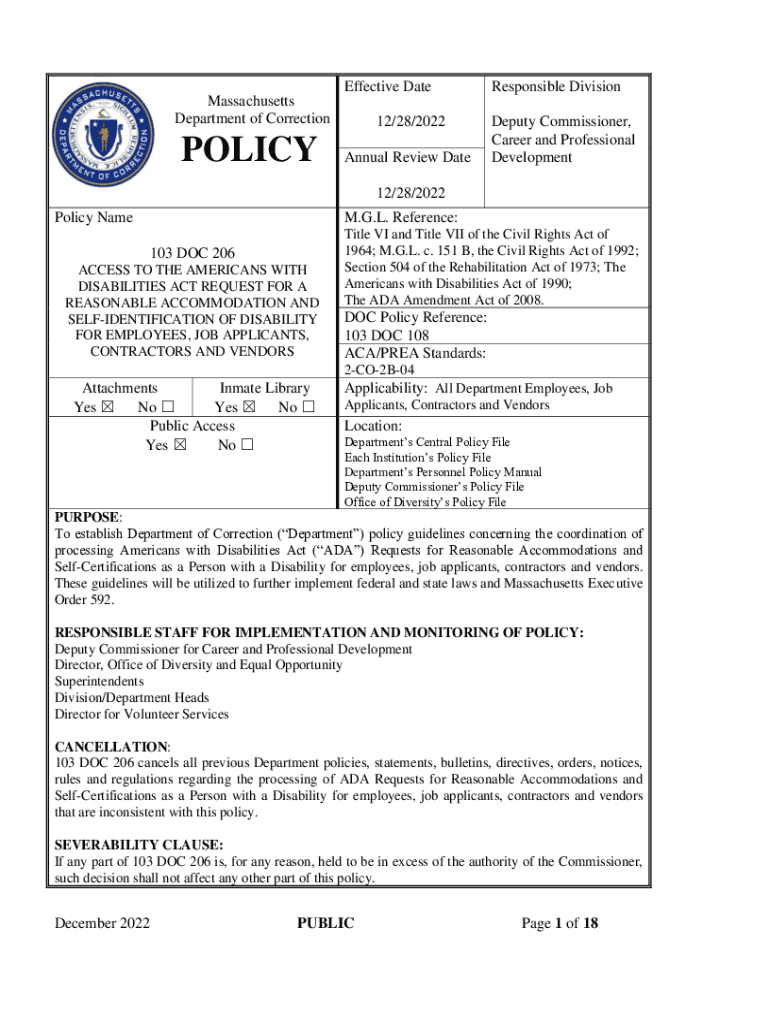 Effective Date Massachusetts Department of Correction12/28/2022POLICYAnnual Review DateResponsible Division Deputy Commissioner, Career and Professional Development12/28/2022 Policy Name. G.L. Reference: