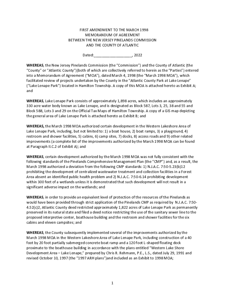 FIRST AMENDMENT TO THE MARCH 1998 MEMORANDUM OF AGREEMENT BETWEEN THE NEW JERSEY VINELAND COMMISSION AND THE COUNTY OF ATLANTIC Dated:___, 2022 WHEREAS, the New Jersey Pin elands Commission (the Commission)