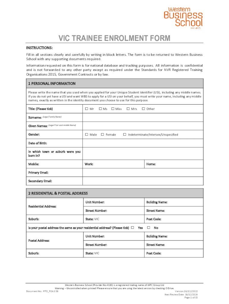 VIC TRAINEE Enrollment FORM INSTRUCTIONS: Fill in all sections clearly and carefully by writing in block letters. The form is to be returned to Western Business School with any supporting documents
