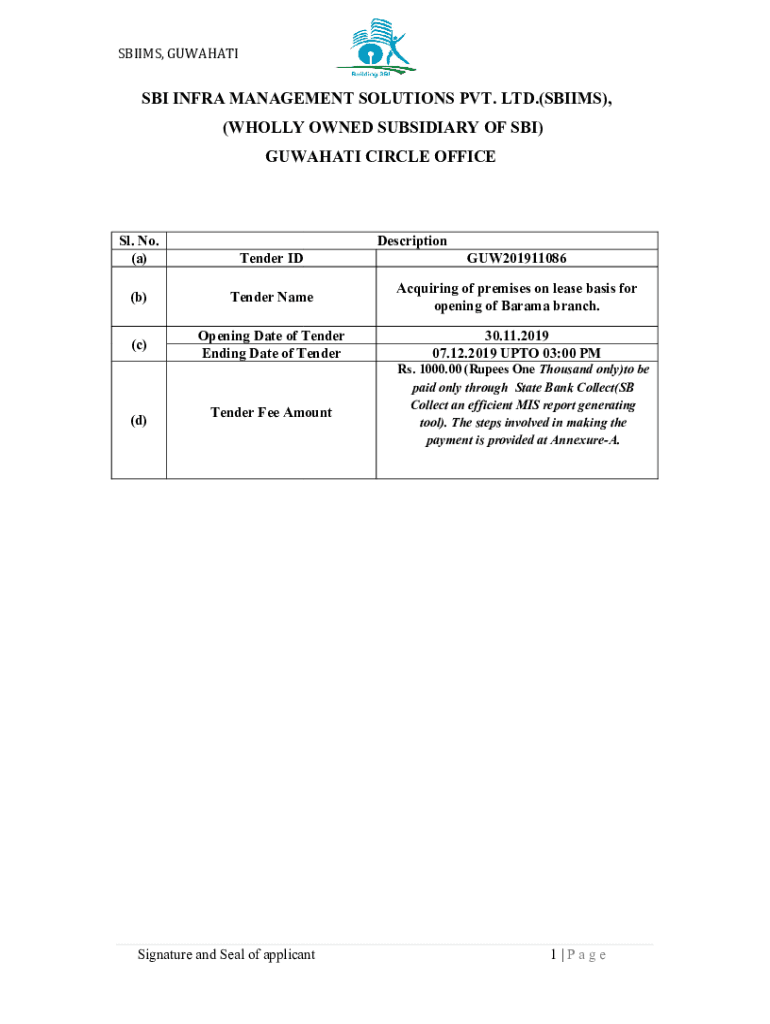 SBI IMS, GUWAHATI INFRA MANAGEMENT SOLUTIONS PVT. LTD.(SBI IMS), (WHOLLY OWNED SUBSIDIARY OF SBI) GUWAHATI CIRCLE Offices. No. (a)Tender ID(b)Tender Name(c)Opening Date of Tender Ending Date of Tender(d)Tender