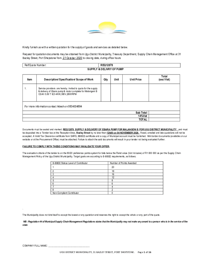 Kindly furnish us with a written quotation for the supply of goods and services as detailed below. Request for quotation documents may be obtained from UGU District Municipality, Treasury Department,