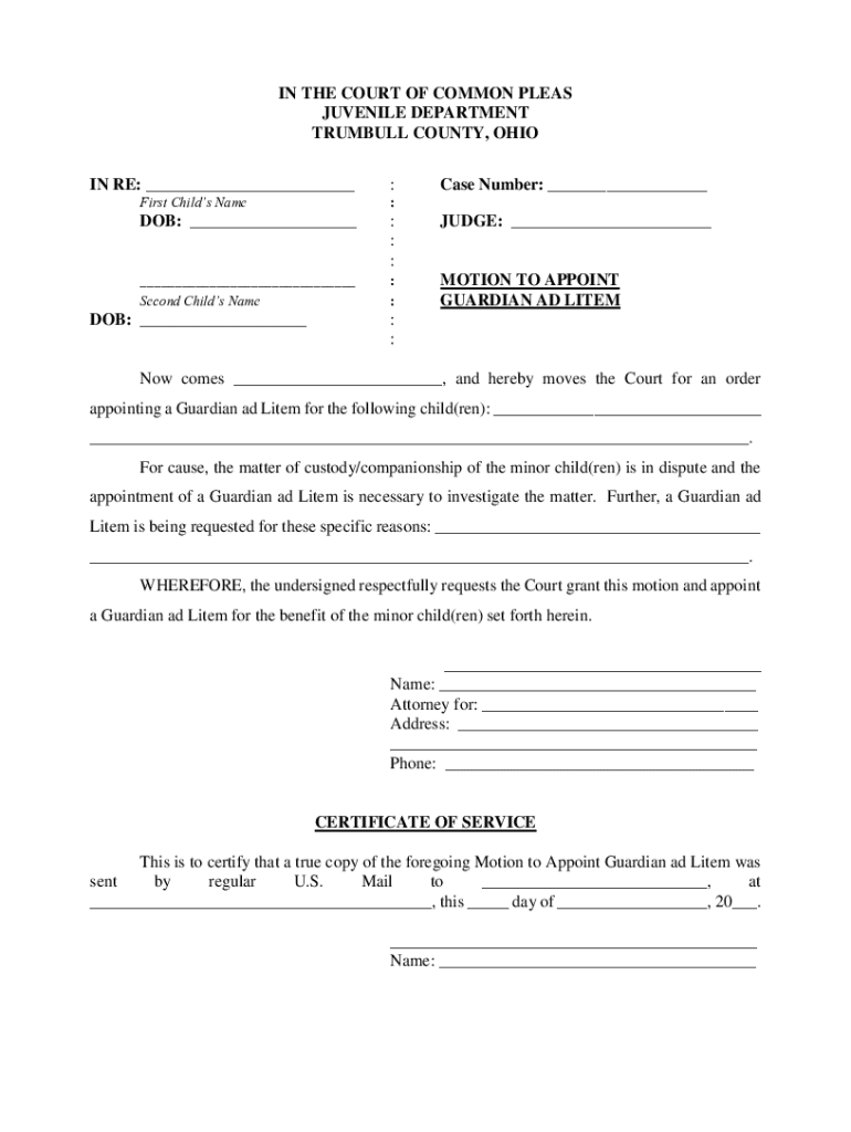 IN THE COURT OF COMMON PLEAS JUVENILE DEPARTMENT TRUMBULL COUNTY, OHIO IN RE: ___:Case Number: ___First Child's Name:DOB: ___: : :JUDGE: ______ Second Child's Name: :MOTION TO APPOINT GUARDIAN AD