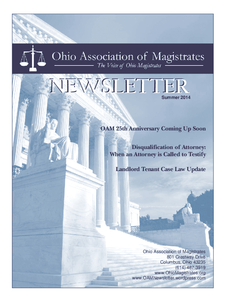 NEWSLETTER Summer 2014OAM 25th Anniversary Coming Up Soon Disqualification of Attorney: When an Attorney is Called to Testify Landlord Tenant Case Law Update Ohio Association of Magistrates 801 Crest