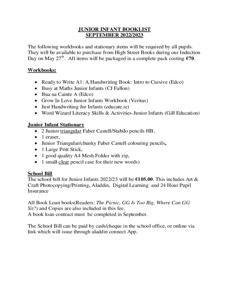 JUNIOR INFANT BOOKLET SEPTEMBER 2022/2023 The following workbooks and stationary items will be required by all pupils. They will be available to purchase from High Street Books during our Induction