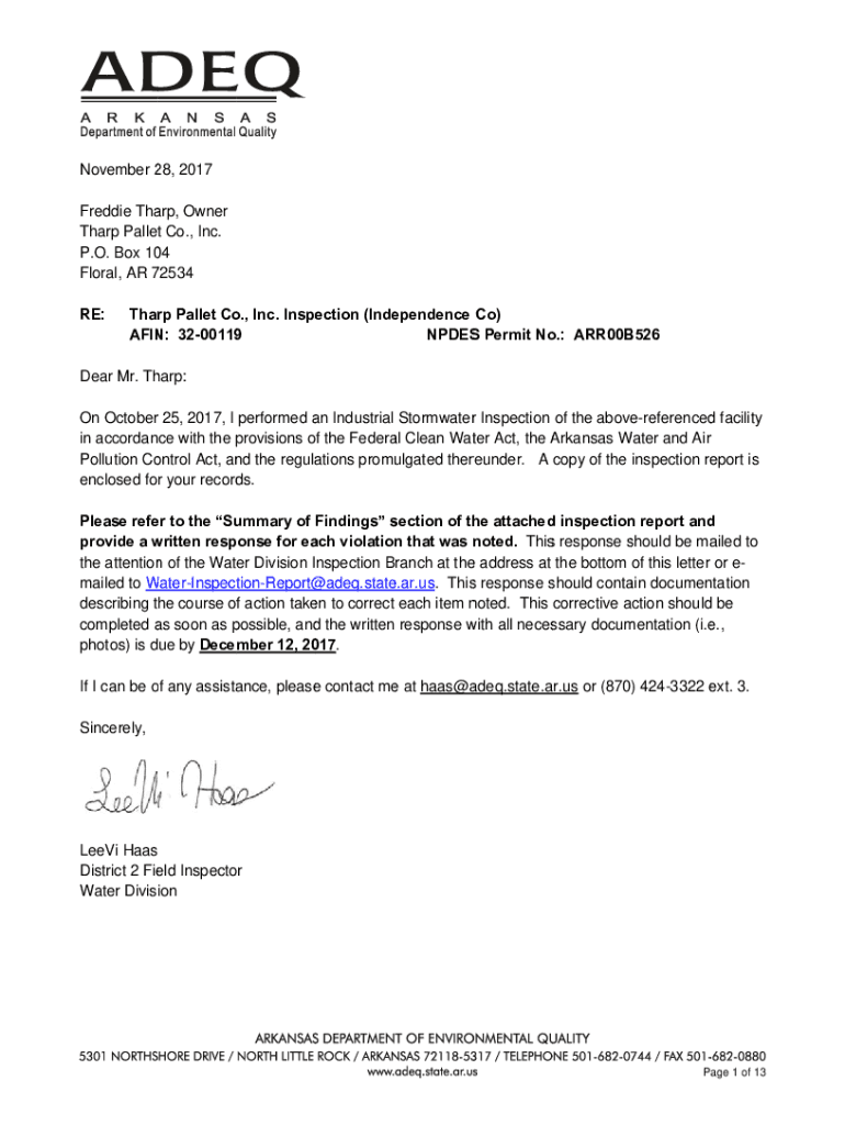 2 2017 November 28, ARP, Owner Freddie They Tharp Pallet Co., Inc. P.O. Box 10 04 Floral, AR 72534 7 RE:o., Inc. INSP action (Index dependence Co) Tharp Pallet Co NODES AKIN N: 3200119 9 S Permits