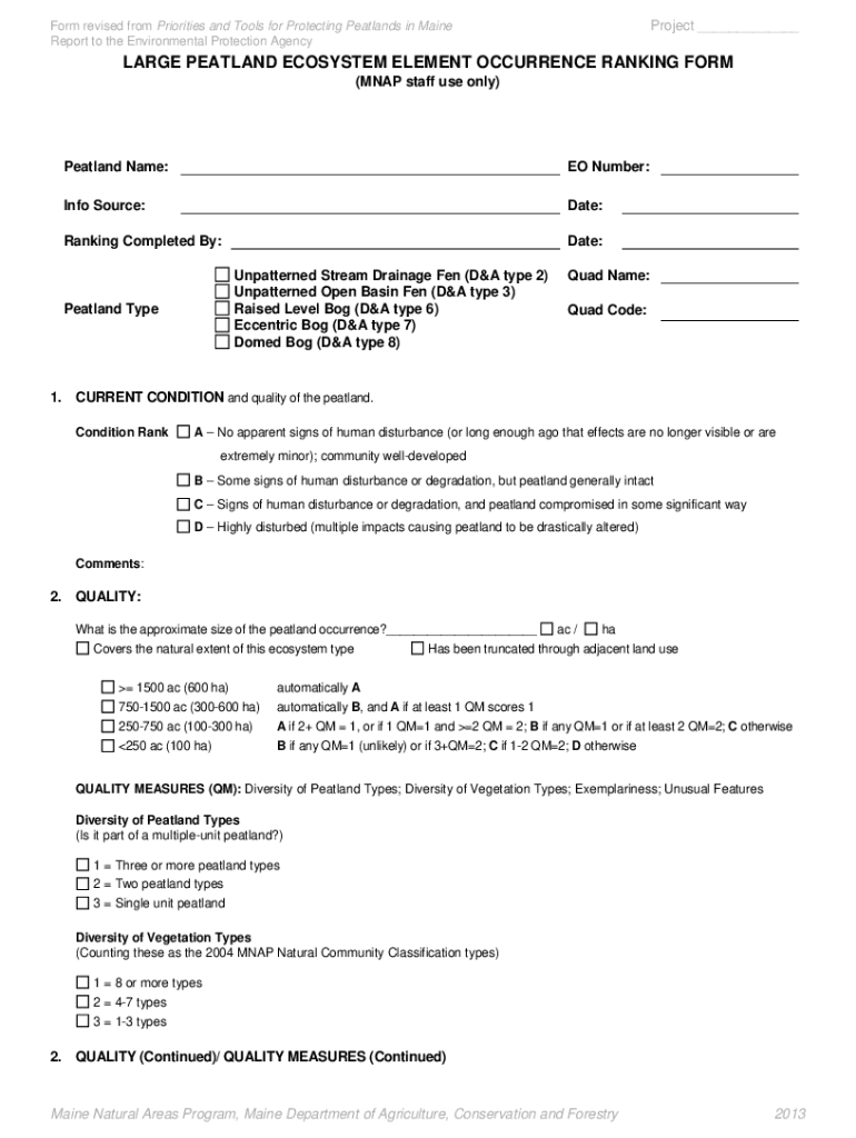 Project ___Form revised from Priorities and Tools for Protecting Peatlands in Maine Report to the Environmental Protection AgencyLARGE PEATLAND ECOSYSTEM ELEMENT OCCURRENCE RANKING FORM (MAP staff