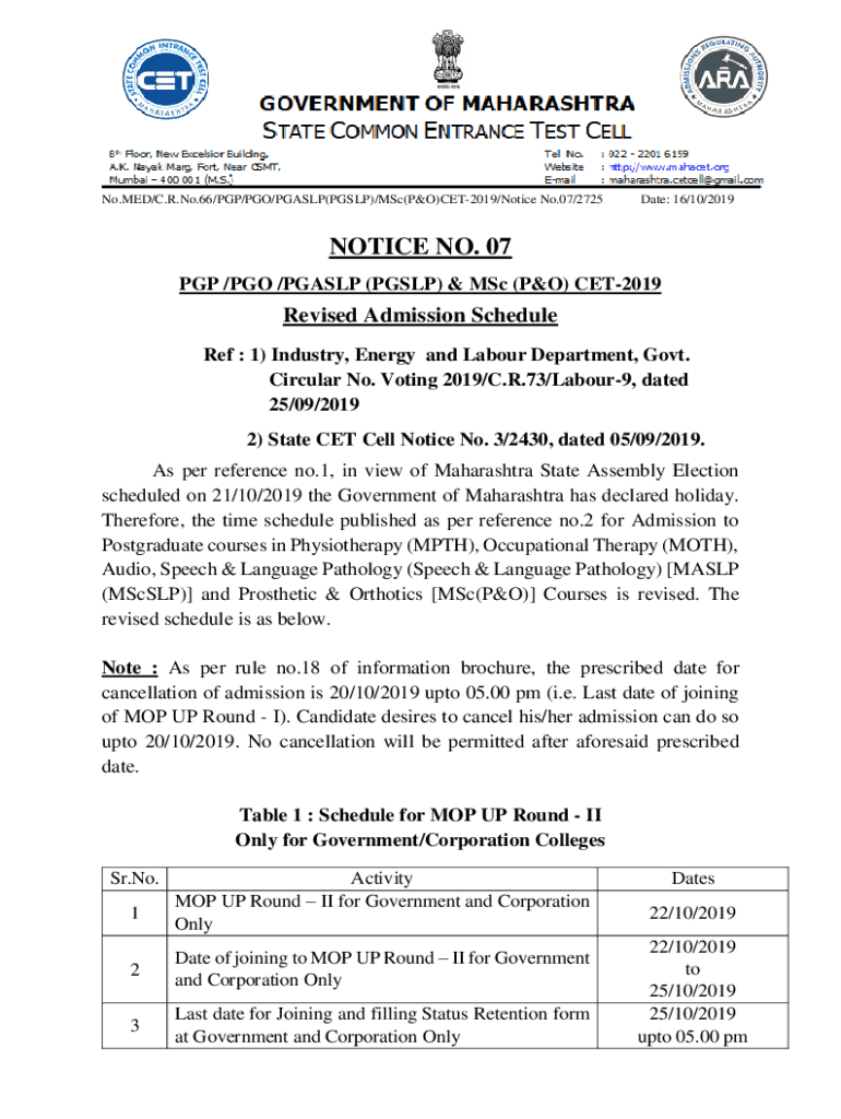 No.MED/C.R. No.66/PGP/PGO/PGASLP(PGSLP)/M.Sc.(P&O)CET2019/Notice No.07/2725Date: 16/10/2019NOTICE NO. 07 PGP /PGO /PGA SLP (PG SLP) & M.Sc. (P&O) CET2019Revised Admission Schedule Ref : 1) Industry,