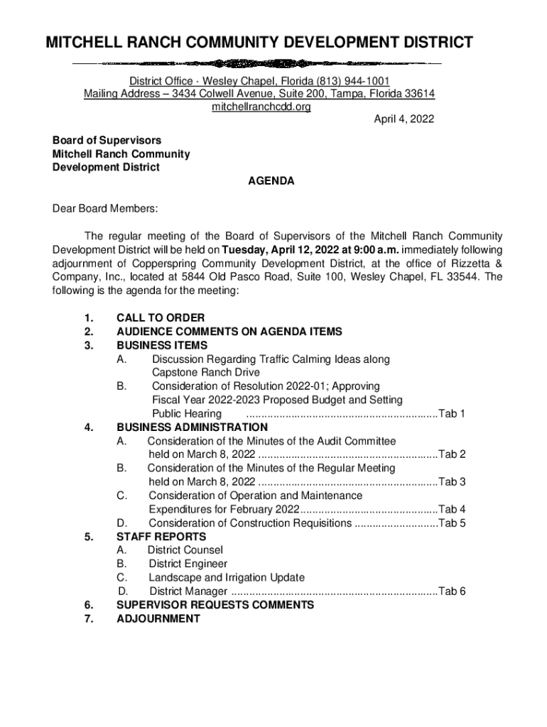 MITCHELL RANCH COMMUNITY DEVELOPMENT DISTRICT Office Wesley Chapel, Florida (813) 9441001 Mailing Address 3434 Cowell Avenue, Suite 200, Tampa, Florida 33614 mitchellranchcdd.org April 4, 2022, Board
