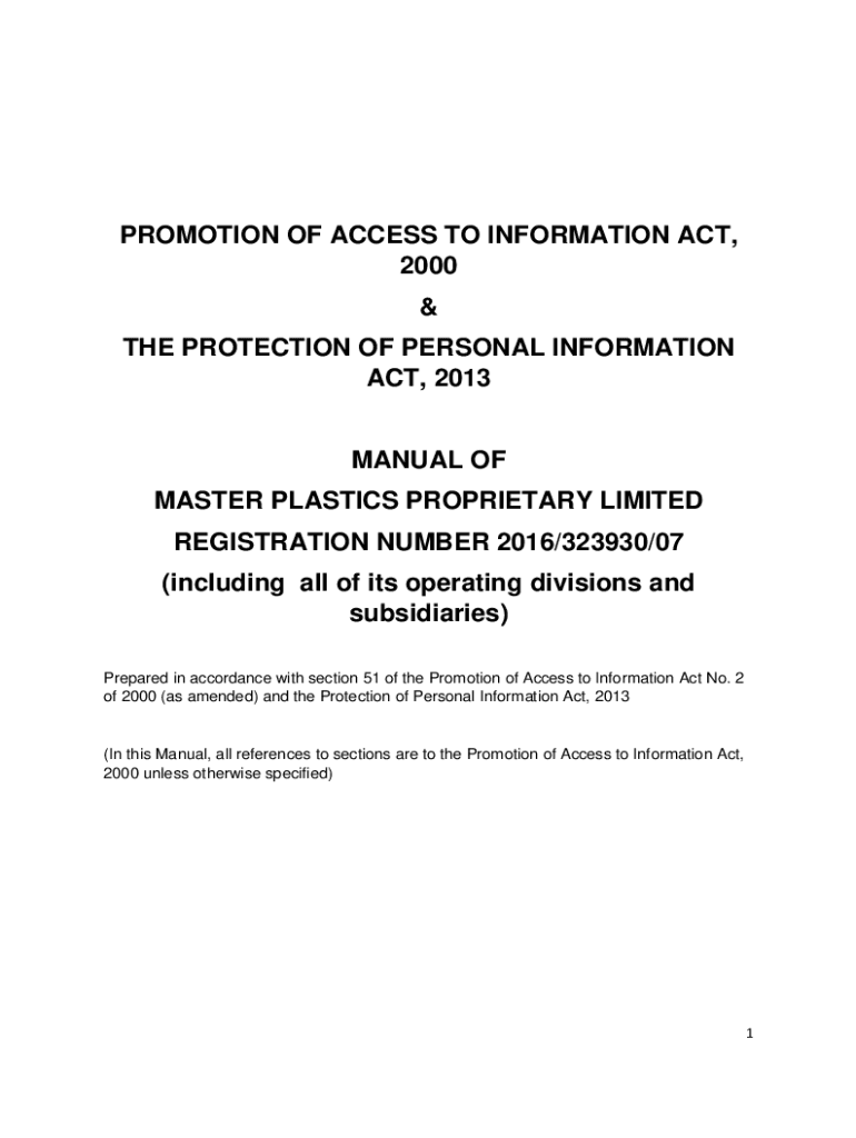 PROMOTION OF ACCESS TO INFORMATION ACT, 2000 & THE PROTECTION OF PERSONAL INFORMATION ACT, 2013 MANUAL OF MASTER PLASTICS PROPRIETARY LIMITED REGISTRATION NUMBER 2016/323930/07 (including all of its