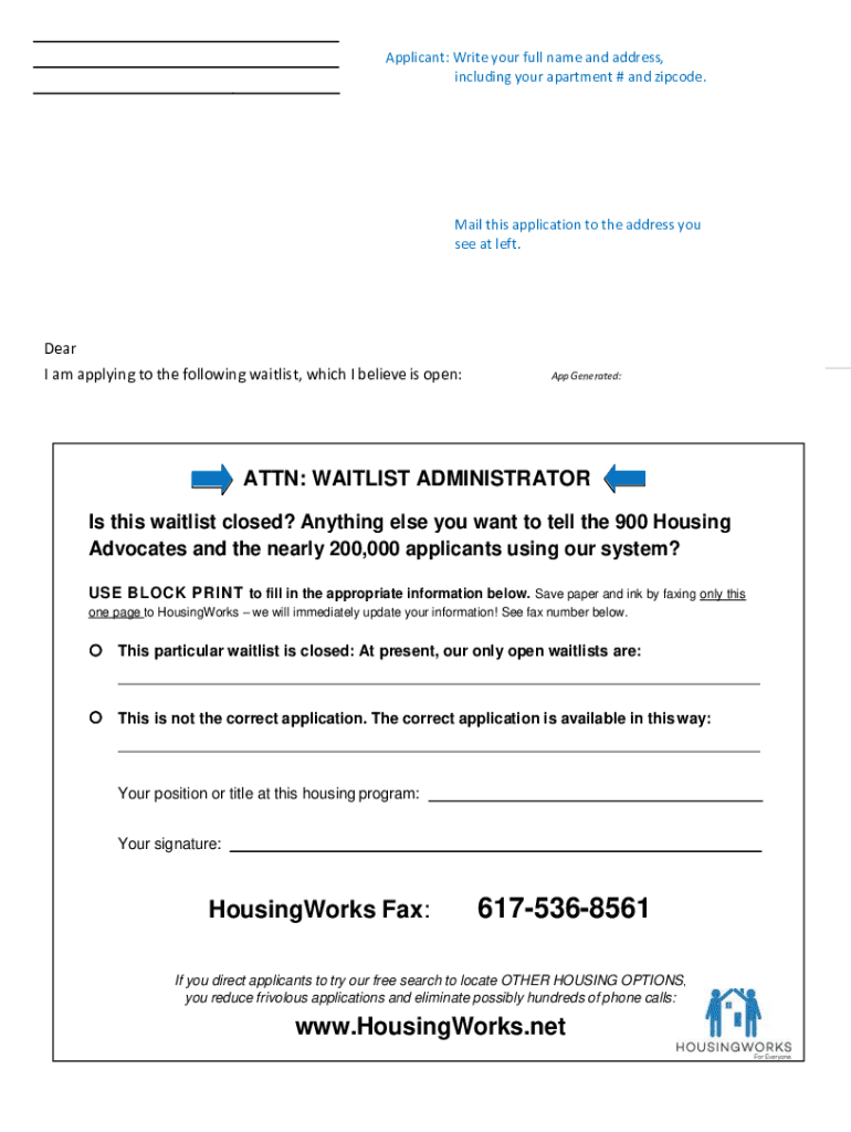 Applicant: Write your full name and address, including your apartment # and zip code. Mail this application to the address you see at left. Dear I am applying to the following waitlist, which I believe