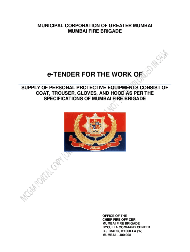 MUNICIPAL CORPORATION OF GREATER MUMBAI FIRE BRIGADEeTENDER FOR THE WORK OF SUPPLY OF PERSONAL PROTECTIVE EQUIPMENTS CONSIST OF COAT, TROUSER, GLOVES, AND HOOD AS PER THE SPECIFICATIONS OF MUMBAI