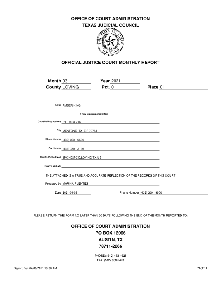OFFICE OF COURT ADMINISTRATION TEXAS JUDICIAL COUNCILOFFICIAL JUSTICE COURT MONTHLY Deportment 03 County LOVINGJudgeYear 2021 Pct. 01Place 01AMBER KING If new, date assumed office ___Court Mailing