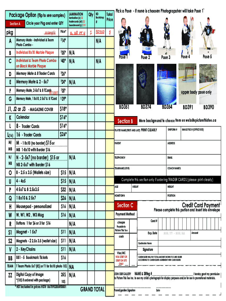 Package Option (flip to see samples) Section APG Circle your Pkg and enter QTY example Price×14×Memory Mate Individual & Team Photo Combo LB Individual 8×10 Marble Plaque E FG Memory Mate & 8 Traders