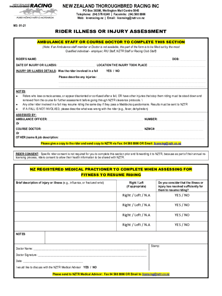 NEW ZEALAND THOROUGHBRED RACING INC PO Box 38386, Wellington Mail Center 5045 Telephone: (04) 576 6240 | Facsimile: (04) 568 8866 Web: love racing.NZ | Email: licensing@nztr.co.nz M3: 0121RIDER ILLNESS