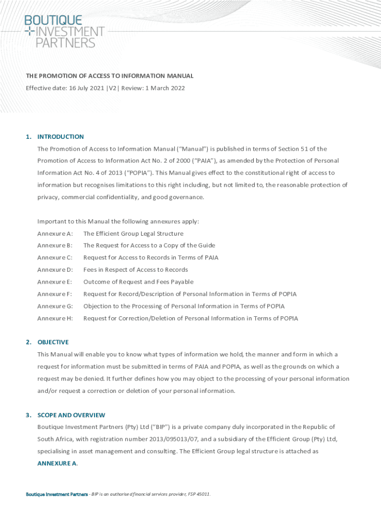 THE PROMOTION OF ACCESS TO INFORMATION MANUAL Effective date: 16 July 2021 |V2| Review: 1 March 20221. INTRODUCTION The Promotion of Access to Information Manual (Manual) is published in terms of