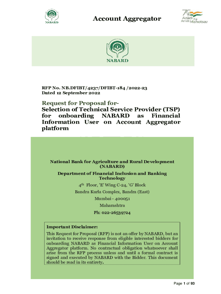 Account Aggregator RFP No. NB.DFIBT/4237/DFIBT184 /202223 Dated 12 September 2022Request for Proposal selection of Technical Service Provider (TSP) for onboarding NAB ARD as Financial Information