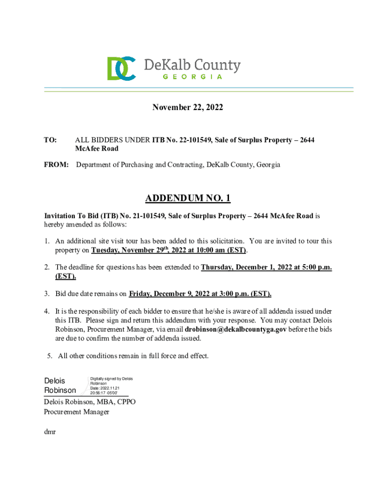 November 22, 2023 TO:ALL BIDDERS UNDER ITB No. 22101549, Sale of Surplus Property 2644 McAfee Roadshow: Department of Purchasing and Contracting, DeKalb County, GeorgiaADDENDUM NO. 1 Invitation To