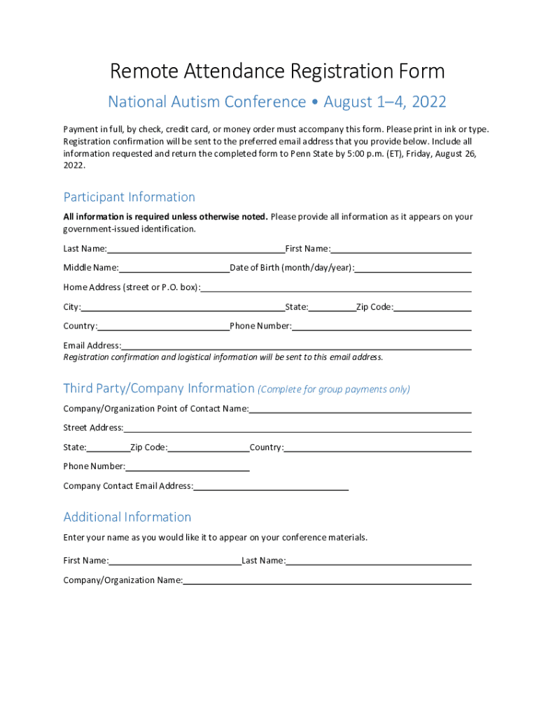 Get the free National Autism Conference Remote Attendance Registration Form - autism outreach psu