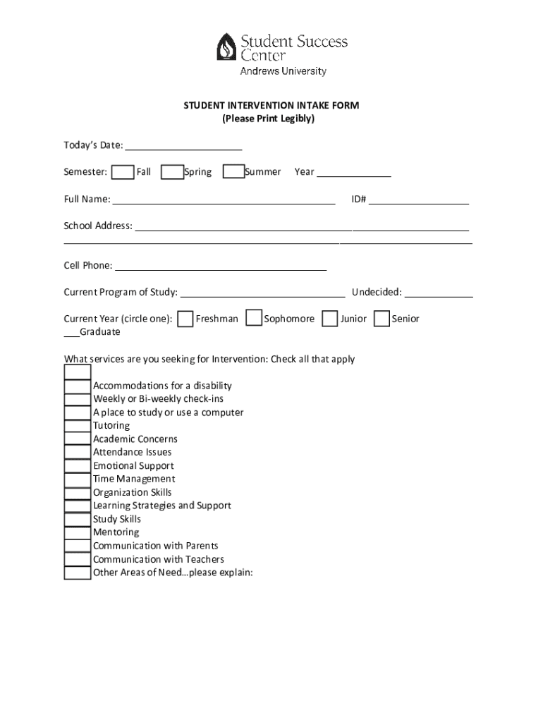 STUDENT INTERVENTION INTAKE FORM (Please Print Legibly) Today's Date: ___ Semester: ___ Fall___Spring___Summer Year ___Full Name: ___ID# ___School Address: ___ ___ Cell Phone: ___ Current Program