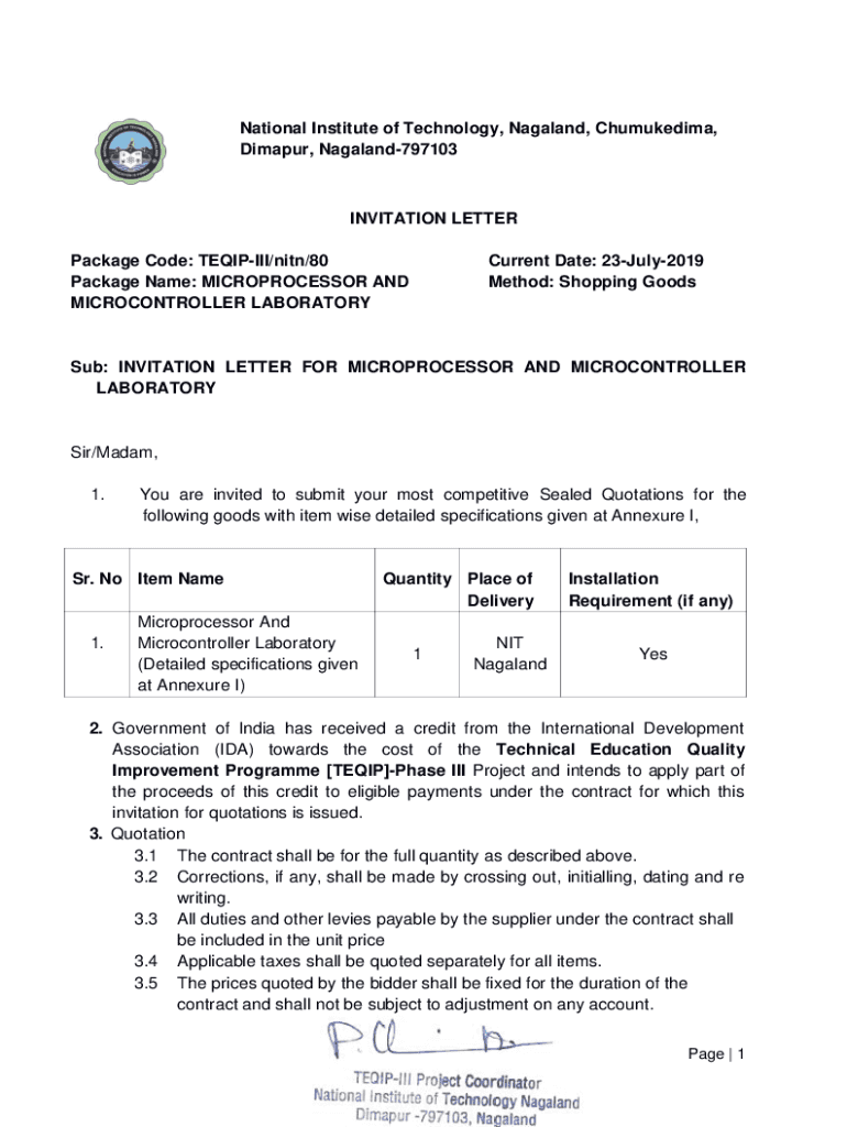 National Institute of Technology, Nagaland, Chumukedima, Dimapur, Nagaland797103INVITATION LETTER Package Code: TEQIPIII/Nita/80 Package Name: MICROPROCESSOR AND MICROCONTROLLER LABORATORYCurrent