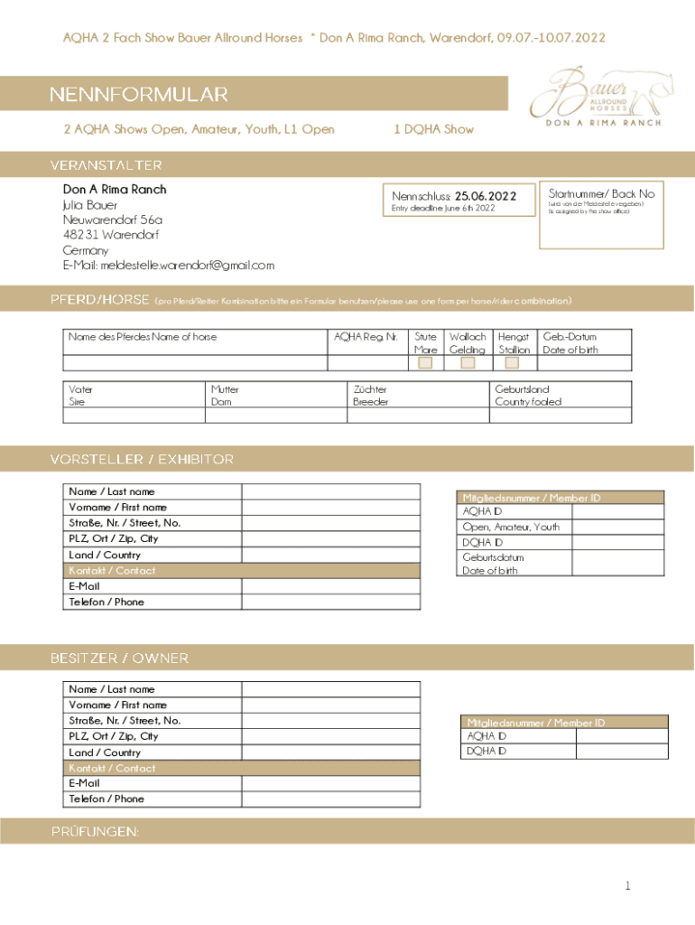 AQUA 2 Each Show Bauer All round Horses * Don A RIMA Ranch, Waldorf, 09.07.10.07.20222 AQUA Shows Open, Amateur, Youth, L1 Open1 DOHA Showdown A RIMA Ranch Julia Bauer Neuwarendorf 56a 48231 Waldorf