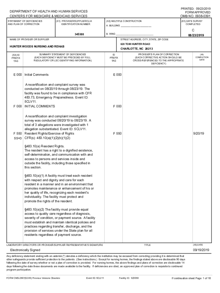PRINTED: 09/23/2019 FORM APPROVEDDEPARTMENT OF HEALTH AND HUMAN SERVICES CENTERS FOR MEDICARE & MEDICAID SERVICES STATEMENT OF DEFICIENCIES AND PLAN OF CORRECTION(X1) PROVIDER/SUPPLIER/CIA IDENTIFICATION