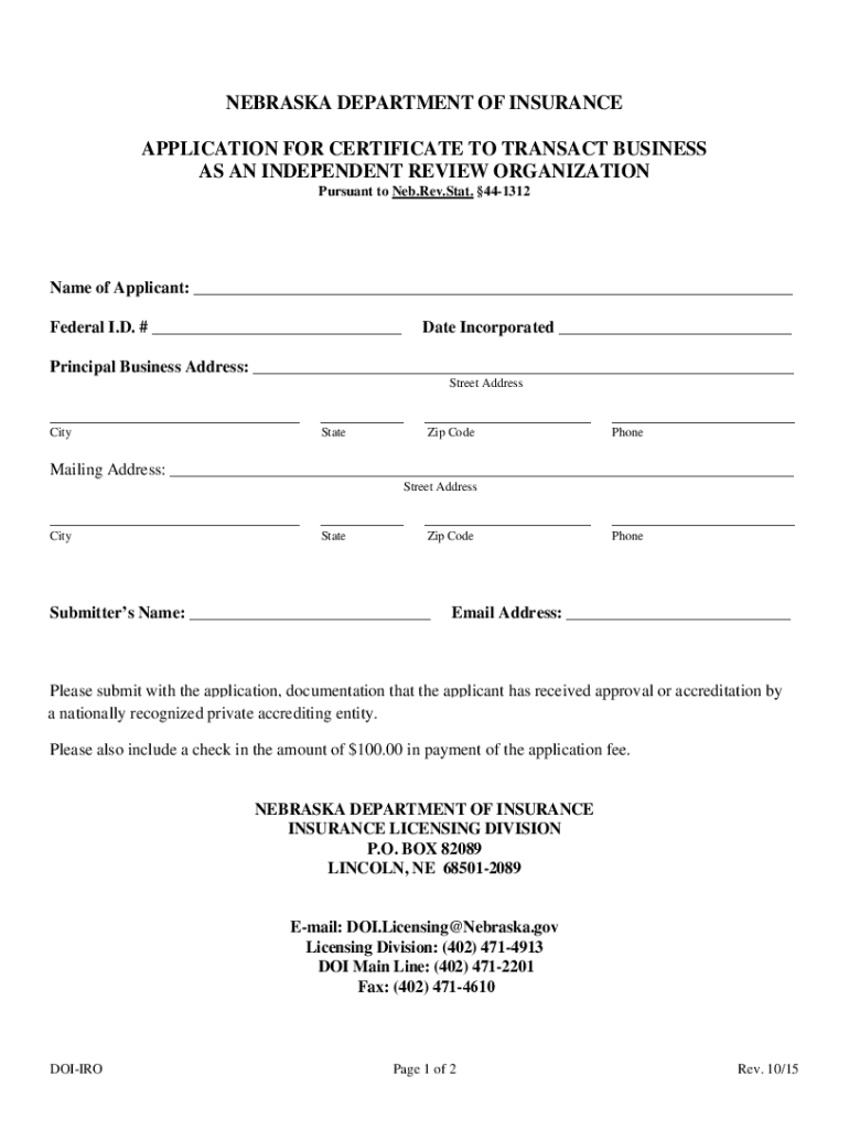NEBRASKA DEPARTMENT OF INSURANCE APPLICATION FOR CERTIFICATE TO TRANSACT BUSINESS AS AN INDEPENDENT REVIEW ORGANIZATION Pursuant to Neb. Rev. Stat. 441312Name of Applicant: ___ Federal I.D. # ___Date