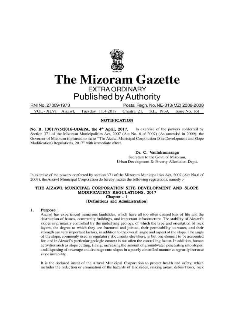 The Mizoram Gazette EXTRA ORDINARYPublished by Authority RNA No. 27009/1973 VOL CLVI Rizal, Tuesday 11.4.2017Postal Reign. No. NE313(MZ) 20062008 Chair 21, S.E. 1939, Issue No. 161NOT IFI CAT ION